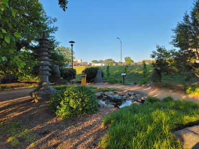 The garden spans 1.7 acres along the Des Moines River, featuring stone pagodas, lanterns, and sculptural rock formations across winding pathways.