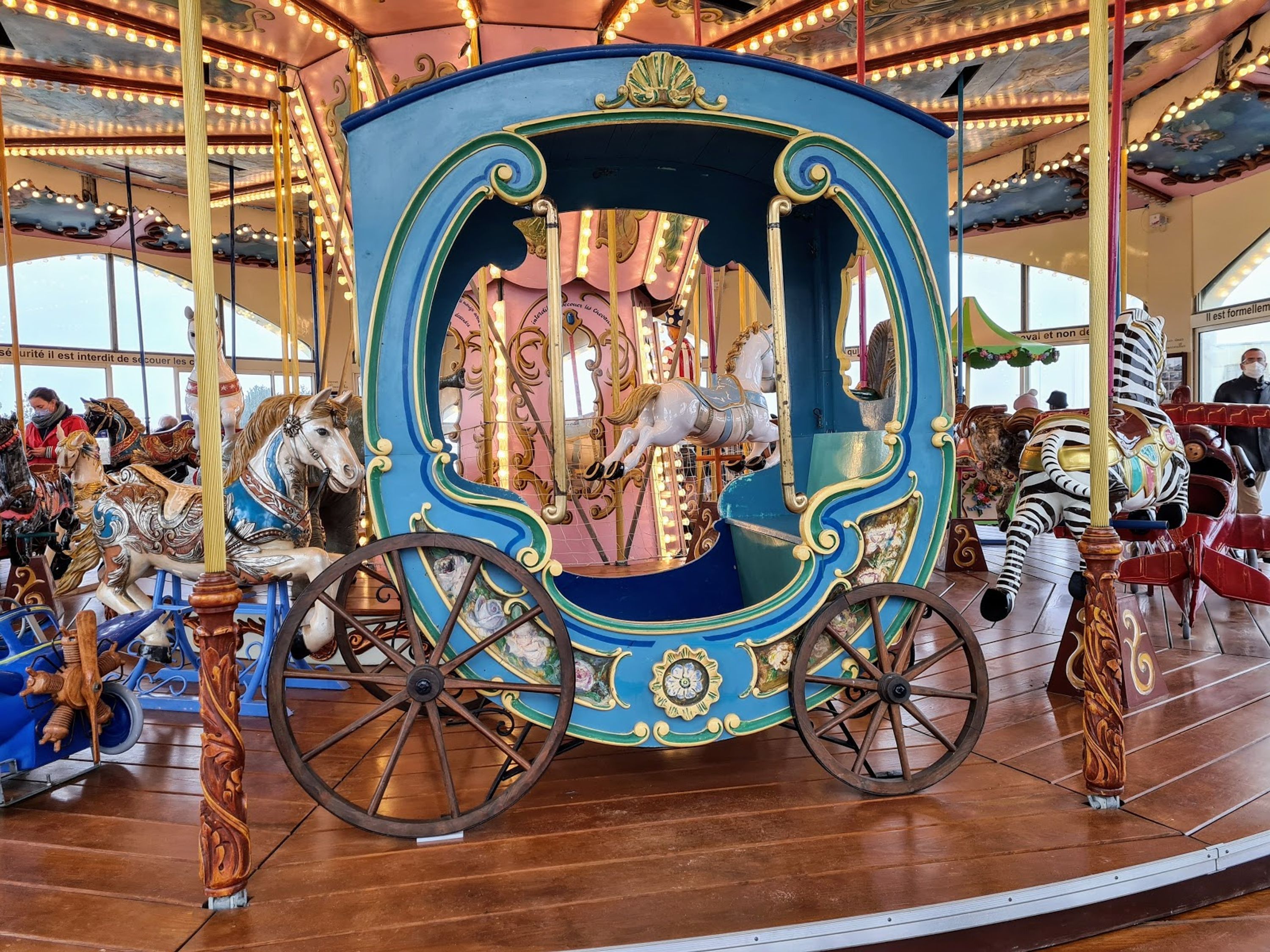The carousel represents a traditional French fairground attraction where generations of families gather for recreational entertainment throughout the seasons.