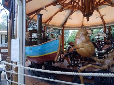 The carousel features mechanical creatures including a steam-powered rhinoceros, a velocipede, and a giant ant that move through the air during rides.