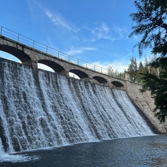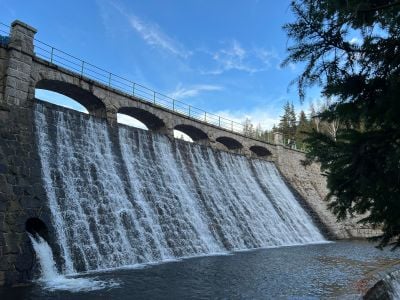The Lomnitztalsperre dam features a 105-meter crown length and creates a reservoir with a storage capacity of 540,000 cubic meters.