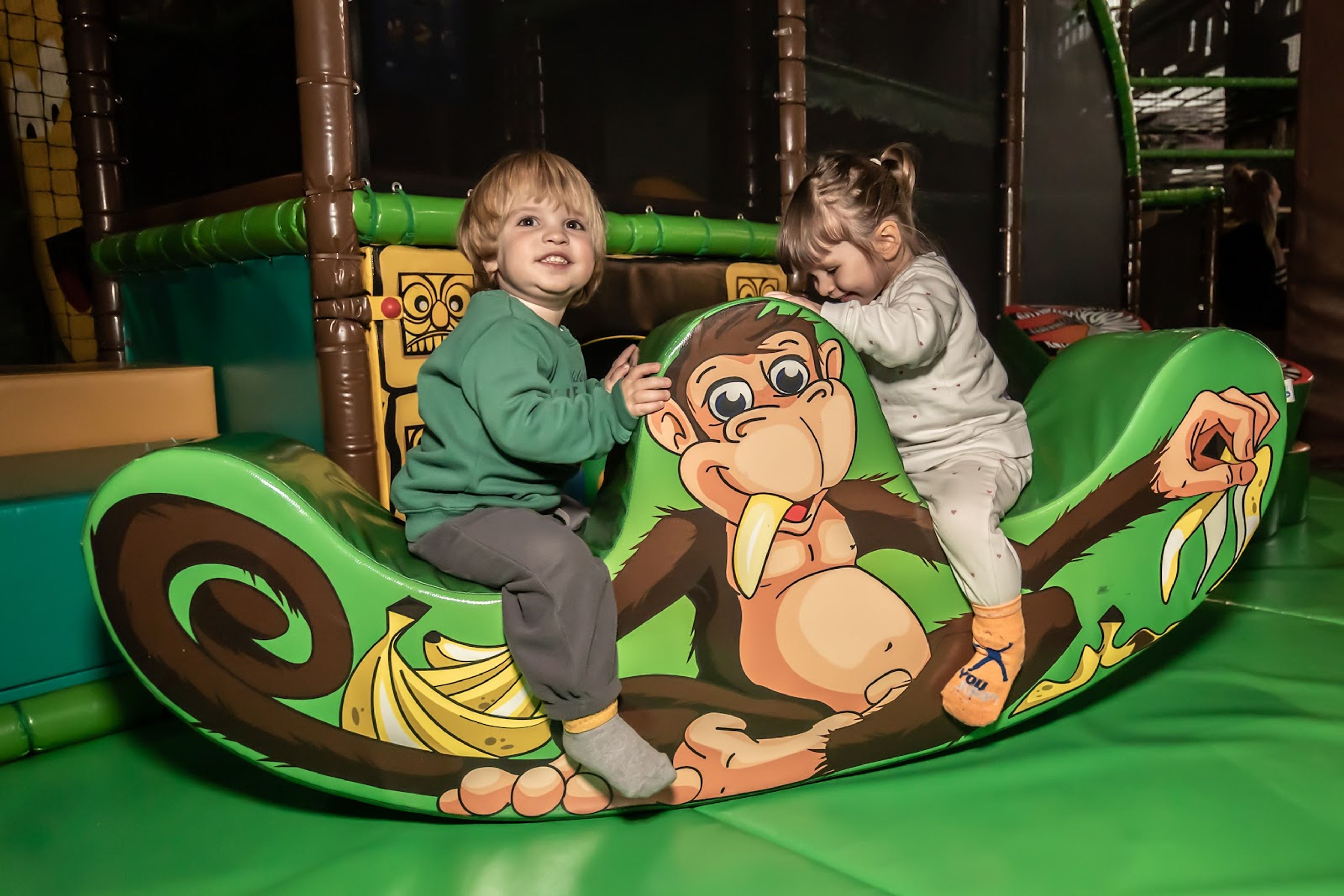 The playground features obstacle courses, climbing walls, ball pits, and slides across 100 square meters of secure space dedicated to children's activities.