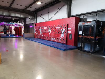 The indoor leisure facility spans over multiple levels with 70 interconnected trampolines, climbing walls, obstacle courses, and a dedicated bowling section.