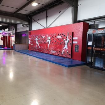 The facility features an auto-belay climbing system with 12 different routes, allowing climbers to practice independently without requiring a partner.