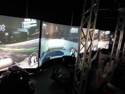 Simfactory features ten hydraulic racing simulators equipped with force feedback steering wheels, pedals, and surround sound headsets for precise driving control.