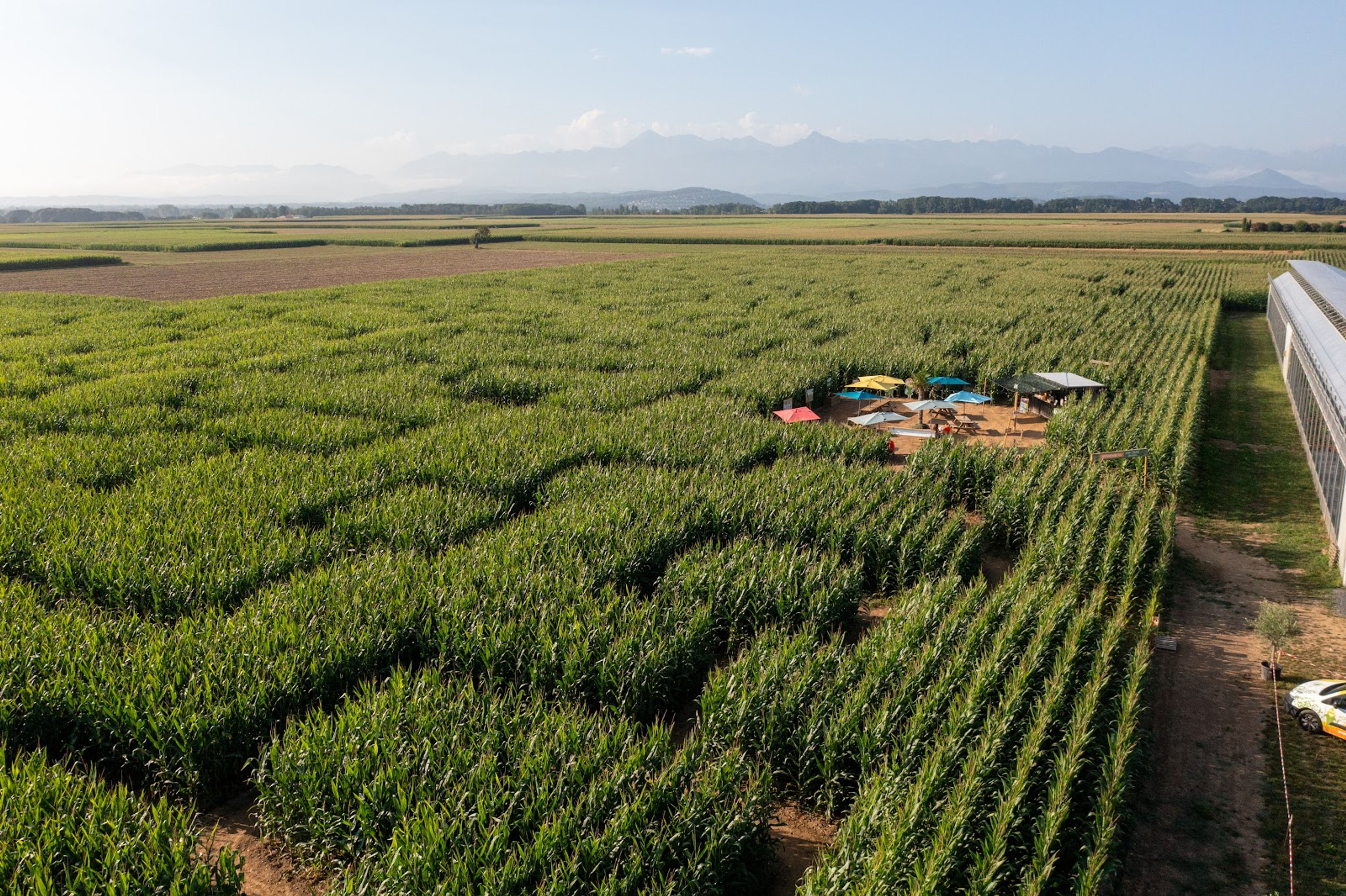 The extensive corn maze covers four hectares of agricultural land with five kilometers of winding paths through tall corn stalks near Tarbes.