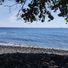 The beach features volcanic black sand stretching along the northern coast of Bali, with Mount Agung creating a dramatic background against the ocean.