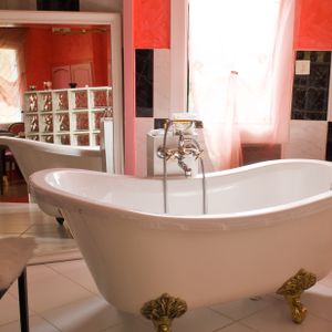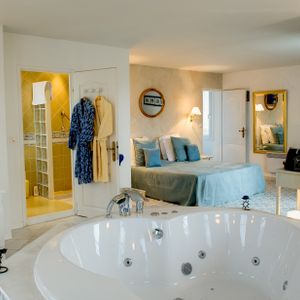 One room features a spacious three-person jacuzzi, while another has a canopied bed tucked into a tower corner. These special spaces make use of the building's original architecture in unexpected ways.