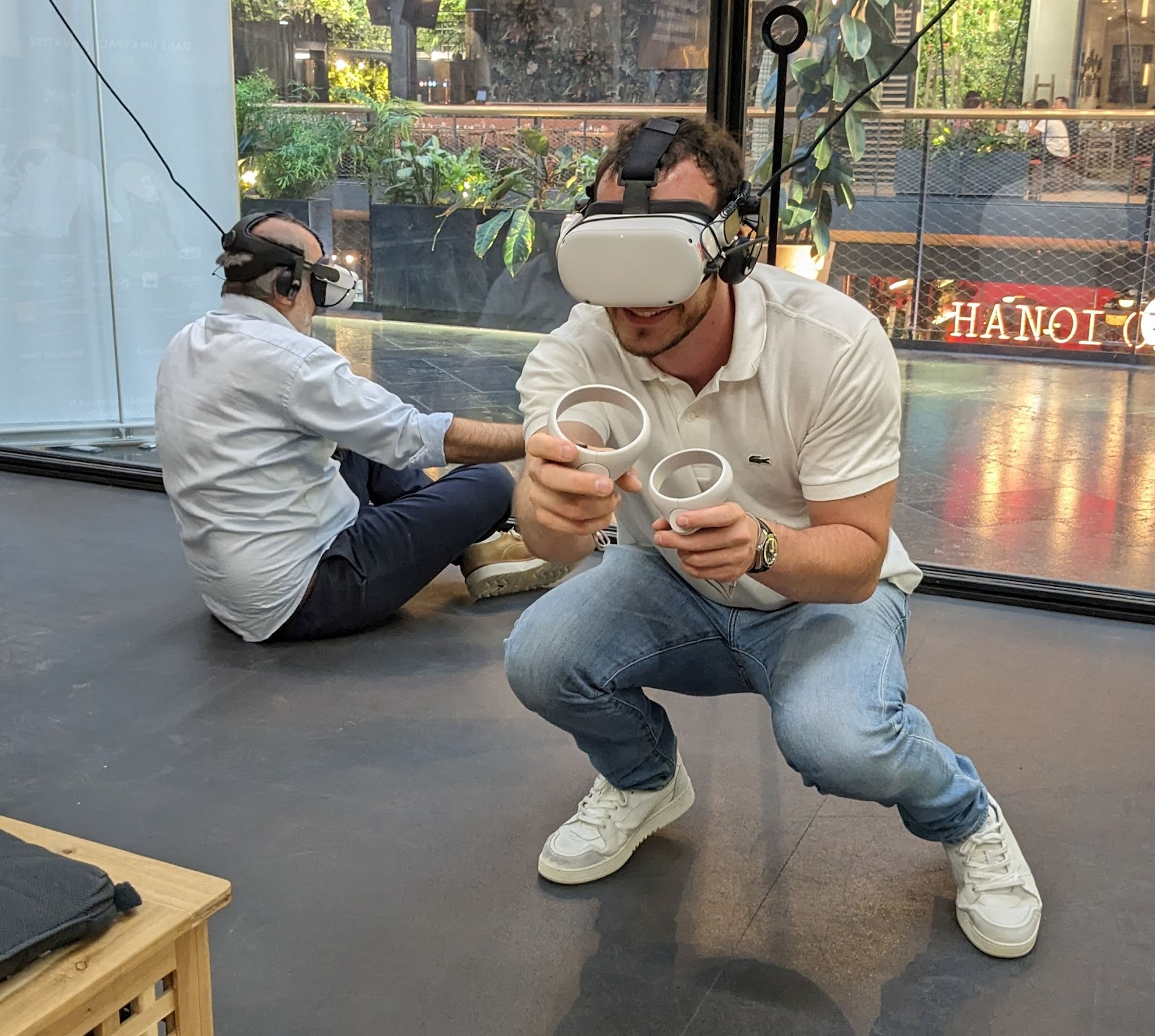 MindOut Vélizy 2 features multiple gaming stations equipped with advanced virtual reality headsets and controllers within a 150-square-meter space in the Westfield shopping center.