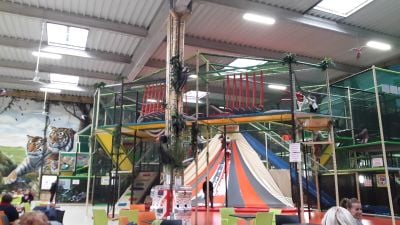 The indoor playground spans 2200 square meters featuring giant slides, trampolines, suspended rope courses, and specialized areas for different age groups.