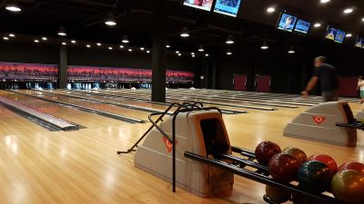 The bowling facility contains several modern lanes equipped with automatic scoring systems and specialized lighting for evening entertainment sessions.