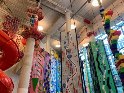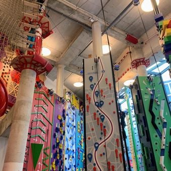 The Hapik climbing facility features multiple climbing walls reaching heights of 26 feet with over 150 routes across 50 distinct vertical surfaces.