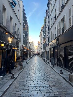 The street houses traditional French bistros next to modern clubs, creating a meeting point where different generations of Parisians gather after sunset.