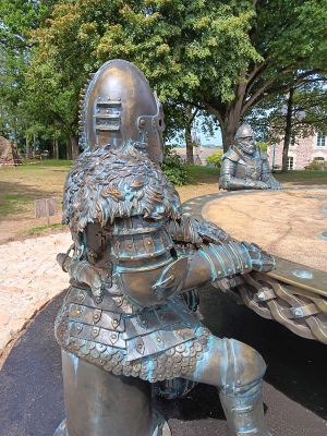 The Round Table of Knights, created by Mickaël Thomazo, displays multiple bronze figures positioned on Saint Michael's mound beneath century-old trees.