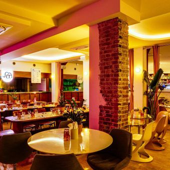 Bonjour Bichat is a restaurant in Paris's 10th arrondissement housed in a former carpentry workshop. The space includes four separate cooking counters, seating for around 130 people, and vintage furniture from the 1960s throughout.
