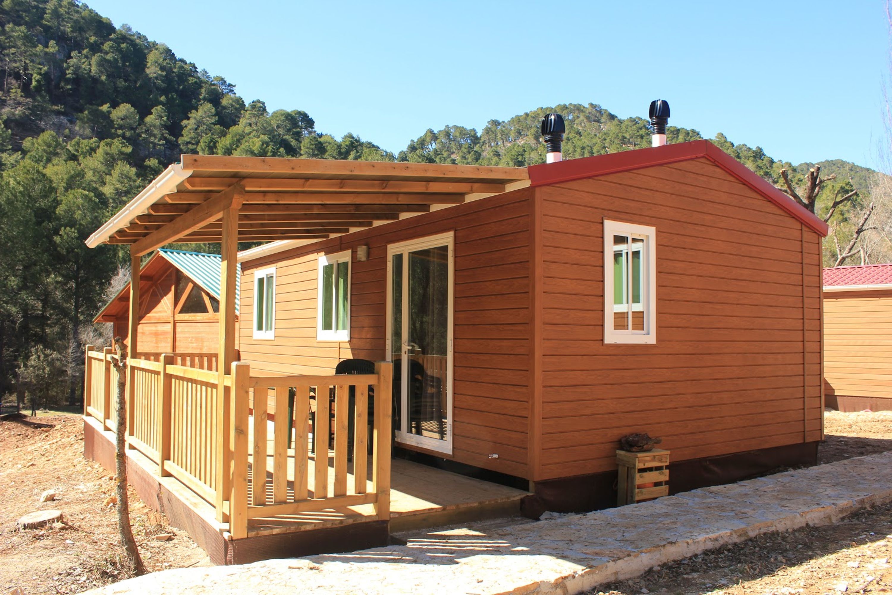 The camping site spans across a natural terrain at 1000 meters elevation, featuring wooden cabins and bungalows next to the Guadalquivir River source.