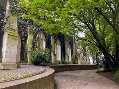The transformation from a bombed church into a public garden in 1971 represents London's approach to preserving historical structures for modern use.