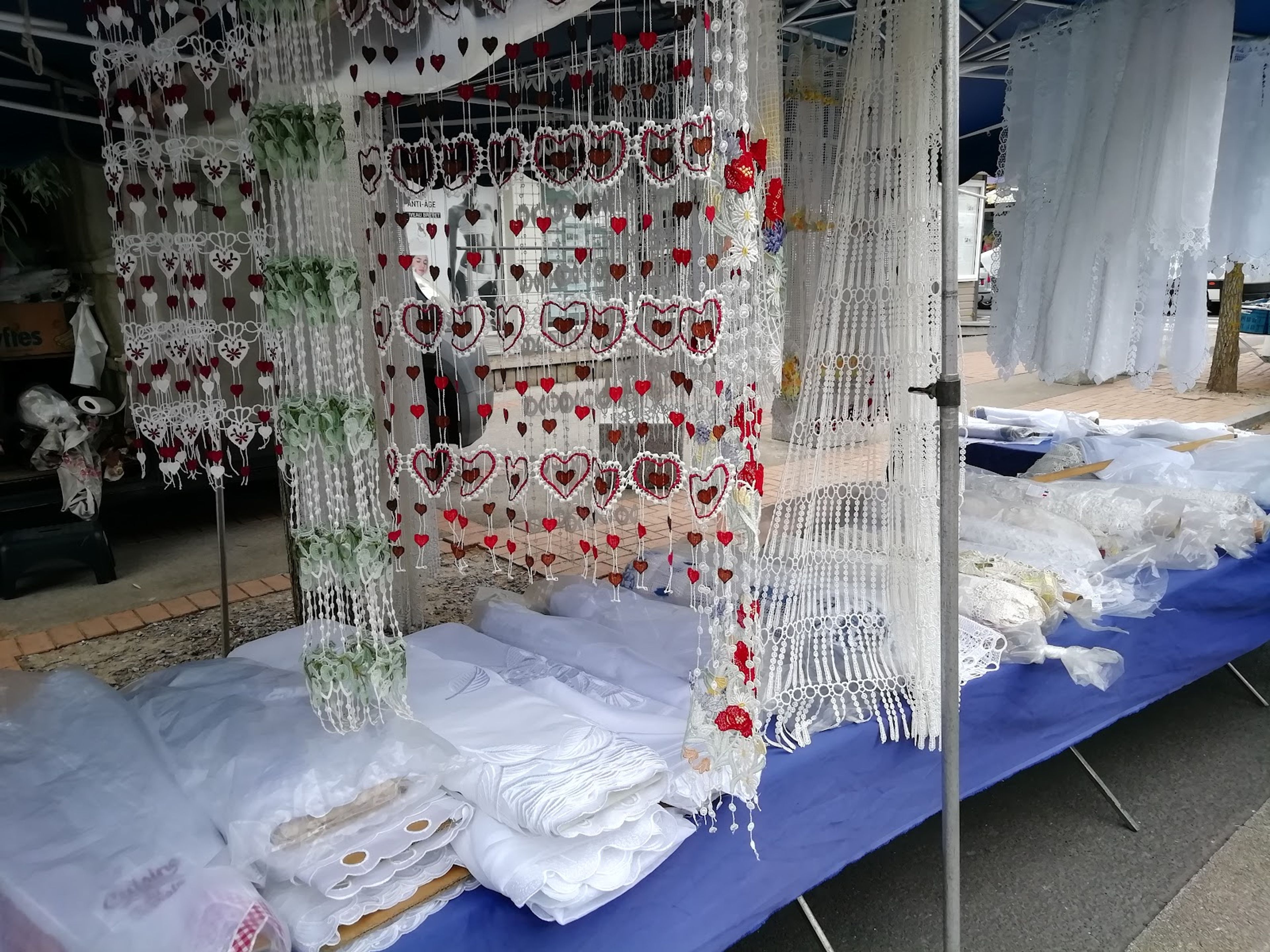 The market features local vendors selling fresh produce, artisanal foods, regional specialties, clothing, and household items across numerous stalls.