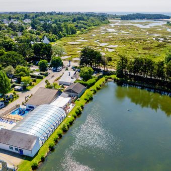 Morbihan Plijadur campground offers both tent pitches and mobile homes across a green terrain near the Atlantic coastline of Brittany.
