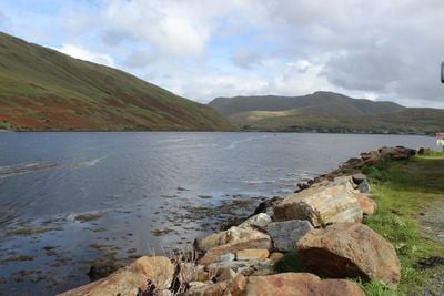 The Mweelrea mountain rises 814 meters above the northern shore while the Twelve Bens create a dramatic backdrop to the south of the waterway.