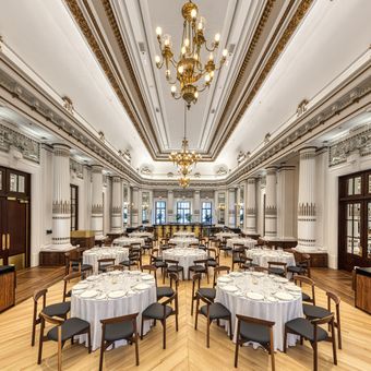 Le Parlementaire is a restaurant located in the National Assembly building with high ceilings, marble columns, and mirrors that reflect natural light from tall windows. The space overlooks the city and serves as a formal dining venue for official gatherings.