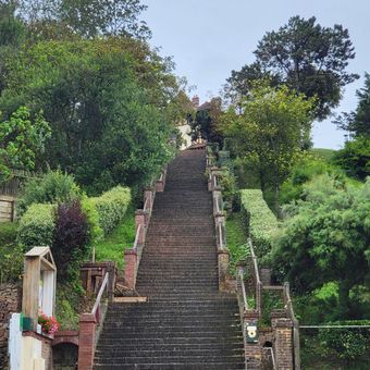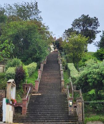 The stone staircase connects the upper residential area of Houlgate with the beach through 139 steps built into the coastal terrain.