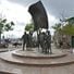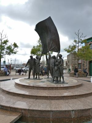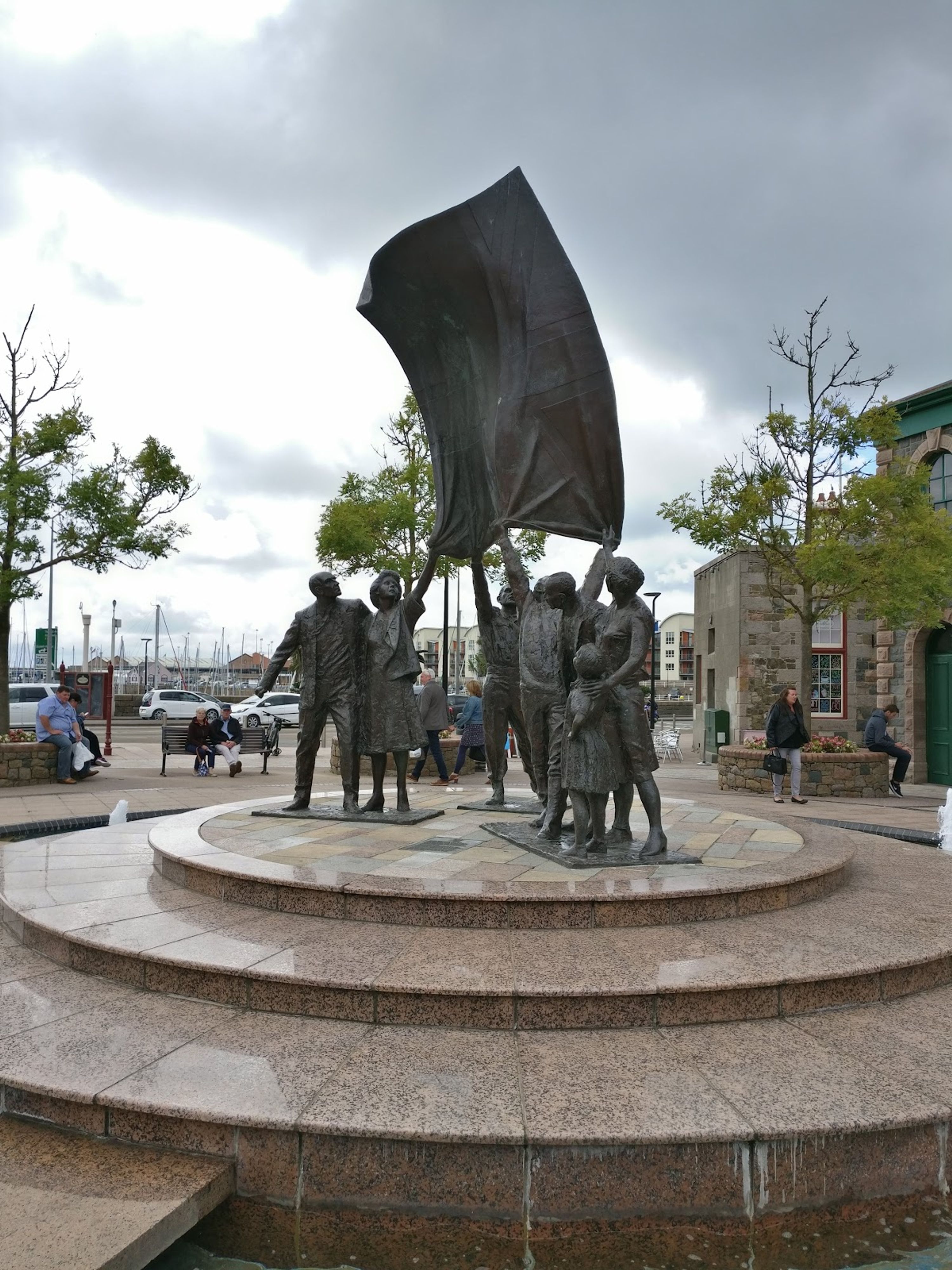 The square features a bronze sculpture depicting citizens waving the Union Jack flag, surrounded by a fountain with twelve water jets.