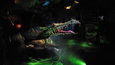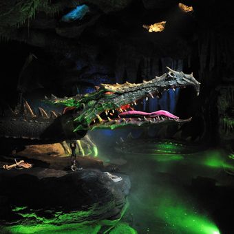 Located beneath Sleeping Beauty Castle, this walk-through cavern features a massive 27-meter animatronic dragon that rests in a dark, rocky environment.