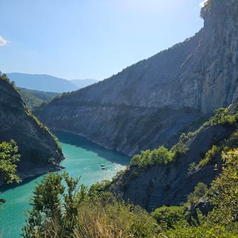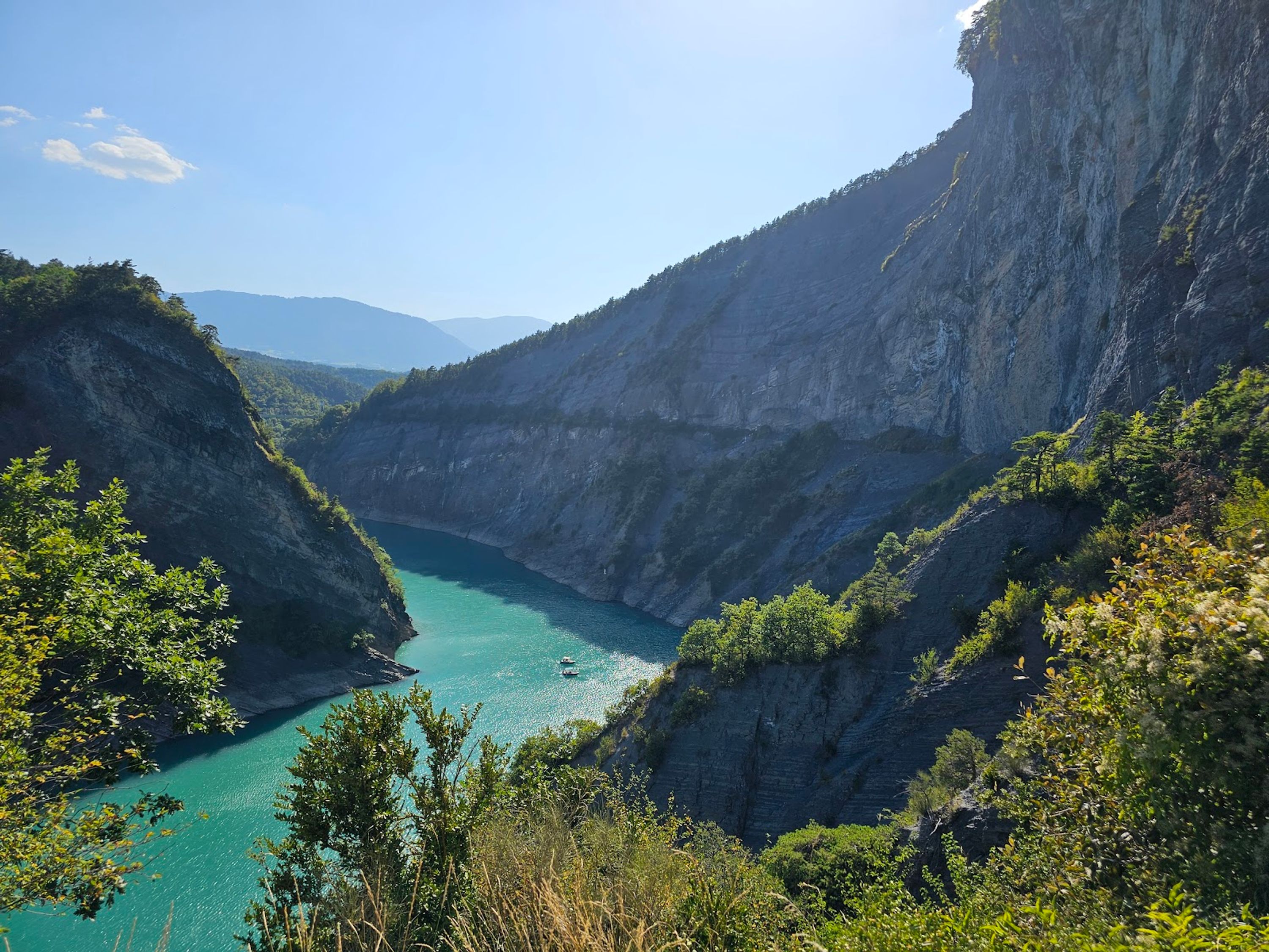 The structure spans between high cliffs at an elevation of 730 meters, offering direct views of Lake Monteynard-Avignonet and the Vercors mountain range.