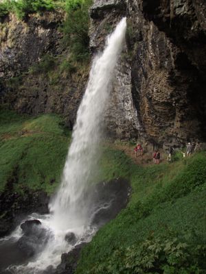 The waterfall features a railway viaduct with 14 arches spanning 190 meters directly above it, creating a rare combination of natural beauty and 19th-century engineering architecture.