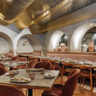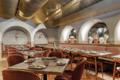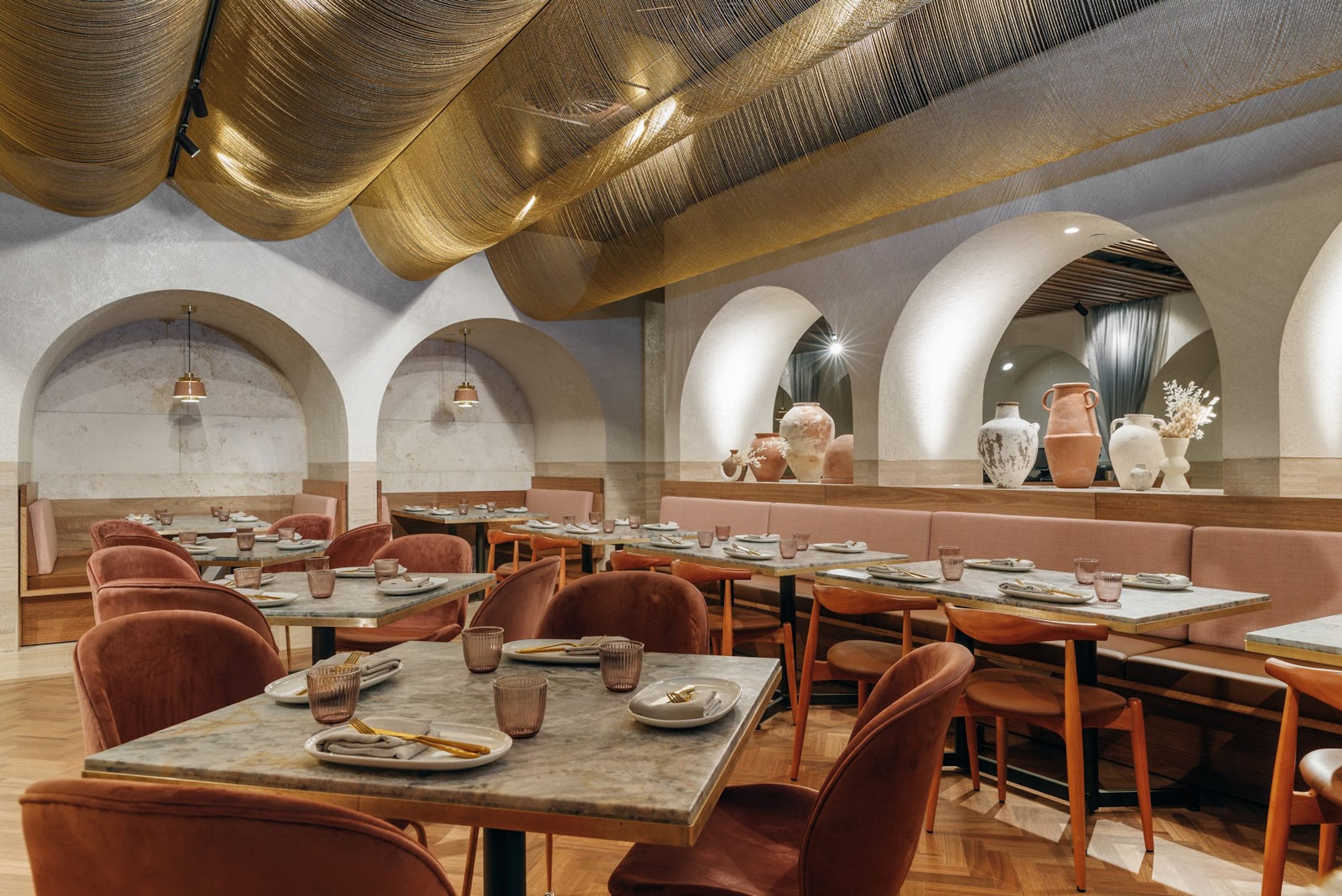 The venue celebrates Middle Eastern and Levantine culinary traditions through communal dining experiences, featuring share-style mezes prepared over charcoal and wood fire, while the decor incorporates traditional motifs that honor the rich cultural heritage of the region.