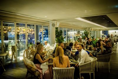 The venue serves coastal Mediterranean dishes infused with Asian flavors in a sharing-style format, while hosting live DJ performances and offering traditional shishas on the stepped deck area for cultural enjoyment.