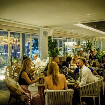 This rooftop establishment features a large outdoor terrace with panoramic views of Dubai Marina, The Palm Jumeirah, and the Arabian Gulf, offering both indoor and outdoor seating with cabanas and regular tables.