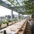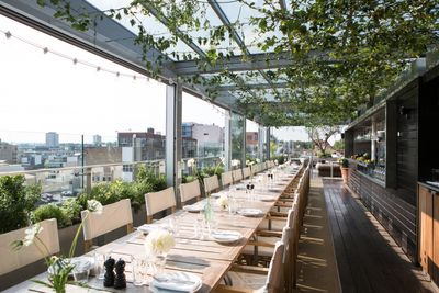 The Boundary rooftop terrace offers panoramic views over London's skyline through its glass Orangery restaurant design, providing guests with an open-air dining experience above the city streets.