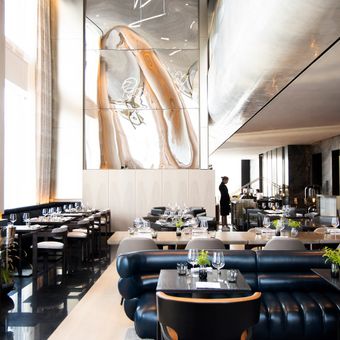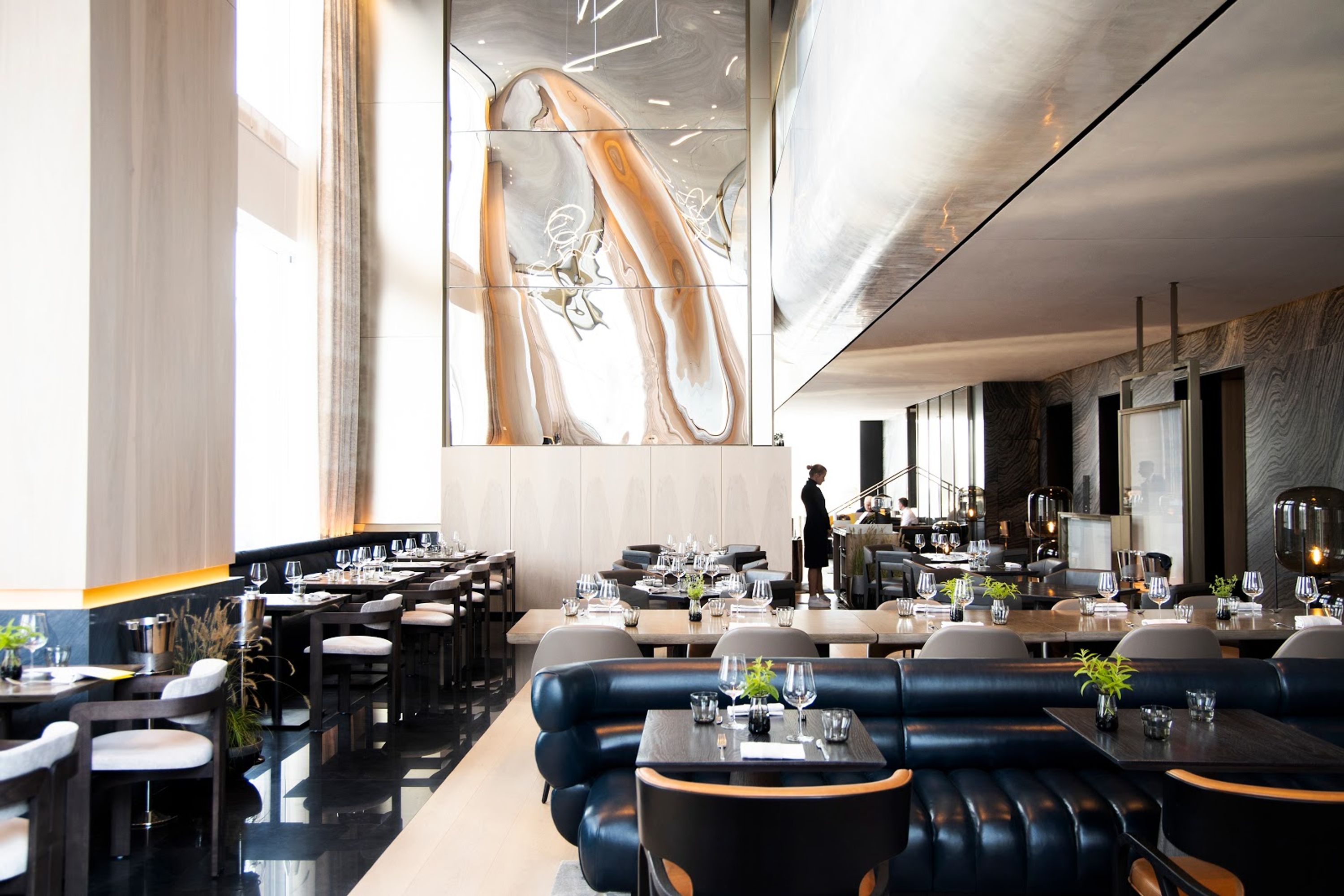 The rooftop features a dedicated garden space with a sculpture by Jaume Plensa, outdoor fire pits for year-round comfort, and a private dining room accommodating up to 72 guests for special events.