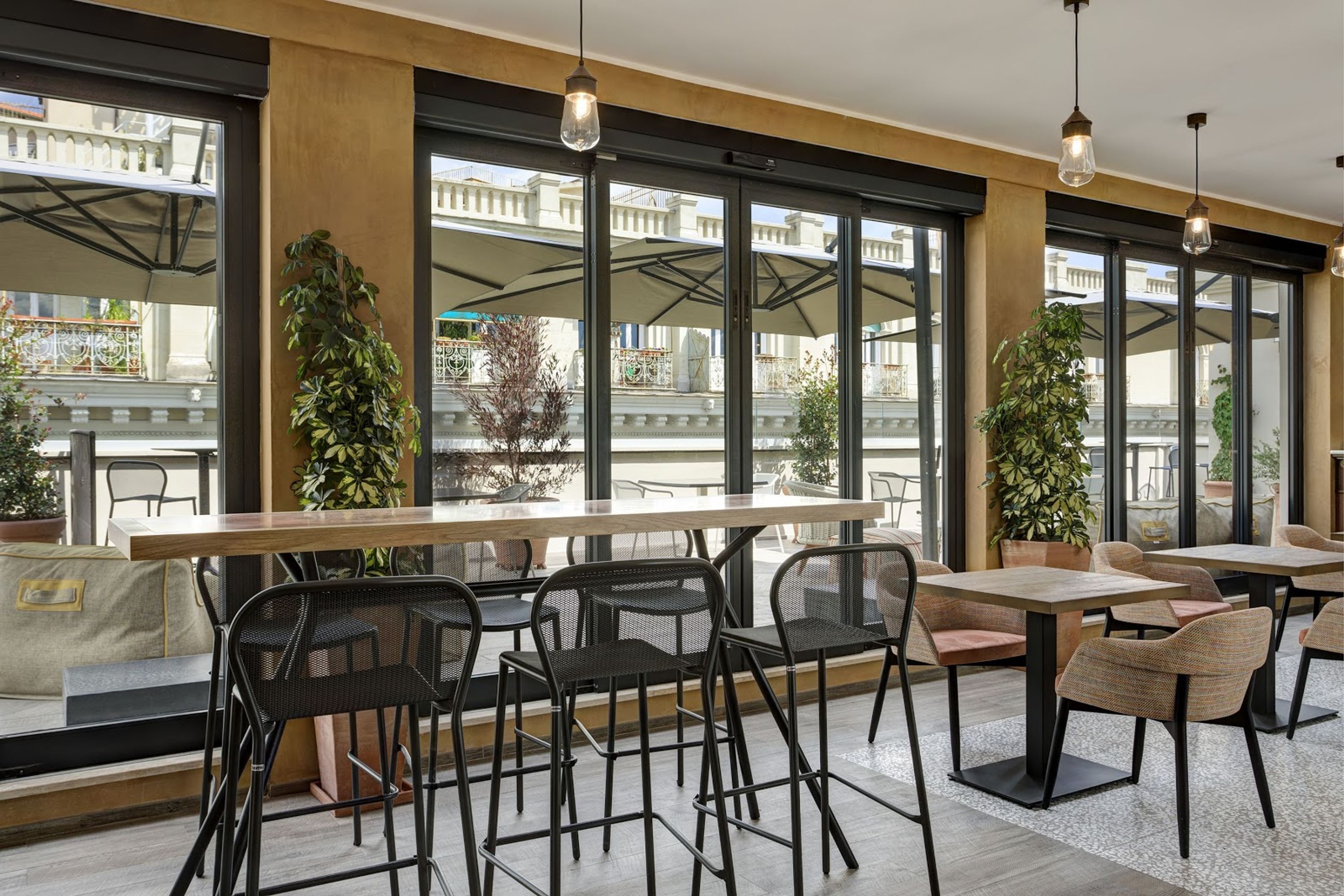 Mùn Rooftop Cocktail Bar sits on the eighth floor of the DoubleTree by Hilton Rome Monti, featuring an expansive outdoor terrace with panoramic views of Rome's skyline and historic domes including Santa Maria Maggiore.