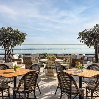 Casa Cami features panoramic views of Tampa Bay from its elevated position, combining an indoor lounge with an outdoor terrace that offers guests scenic vistas while dining and socializing.