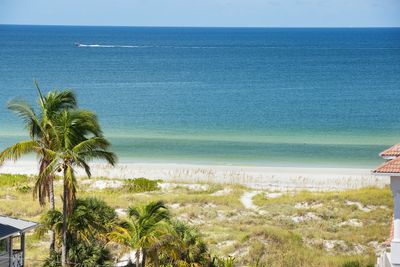 This elevated terrace offers panoramic views of the Gulf Coast while guests enjoy cocktails and beverages in an open-air setting with modern outdoor seating arrangements.