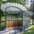 This cast iron structure features stylized plant motifs with enameled lava panels and a double-sloped glass roof supported by three ornate pillars in organic curves.