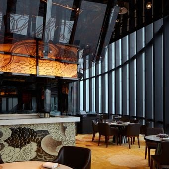 Henshin occupies floors 67 to 69 of the Gama Tower within the Westin Jakarta, featuring multiple dining areas including an indoor restaurant with floor-to-ceiling windows, a bar lounge, and an outdoor terrace that provides panoramic views of Jakarta's skyline.