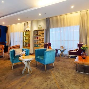 This elevated dining venue spans the 33rd floor of Grand Dafam Ancol hotel, featuring both indoor and outdoor spaces with panoramic views of Jakarta Bay and the city skyline from its distinctive sky bridge structure.