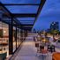 This TransJakarta station features a covered rooftop terrace providing shelter from weather conditions, complemented by an adjacent bar facility that serves refreshments to transit passengers and visitors.