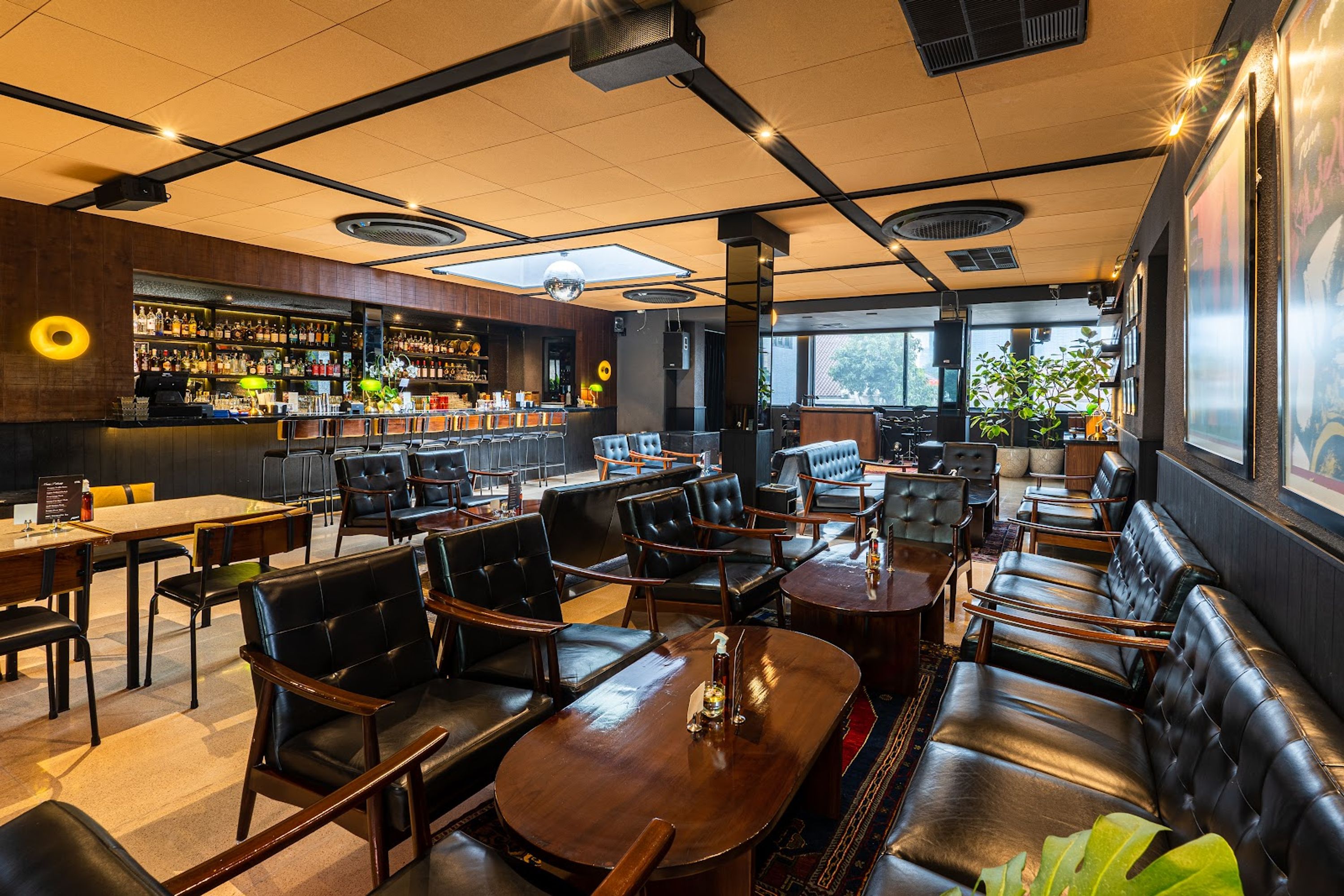 Penn Jakarta features an elevated outdoor terrace that provides panoramic views of Jakarta's urban skyline, complemented by a modern bar serving cocktails, spirits, and non-alcoholic beverages in both indoor and outdoor seating areas.