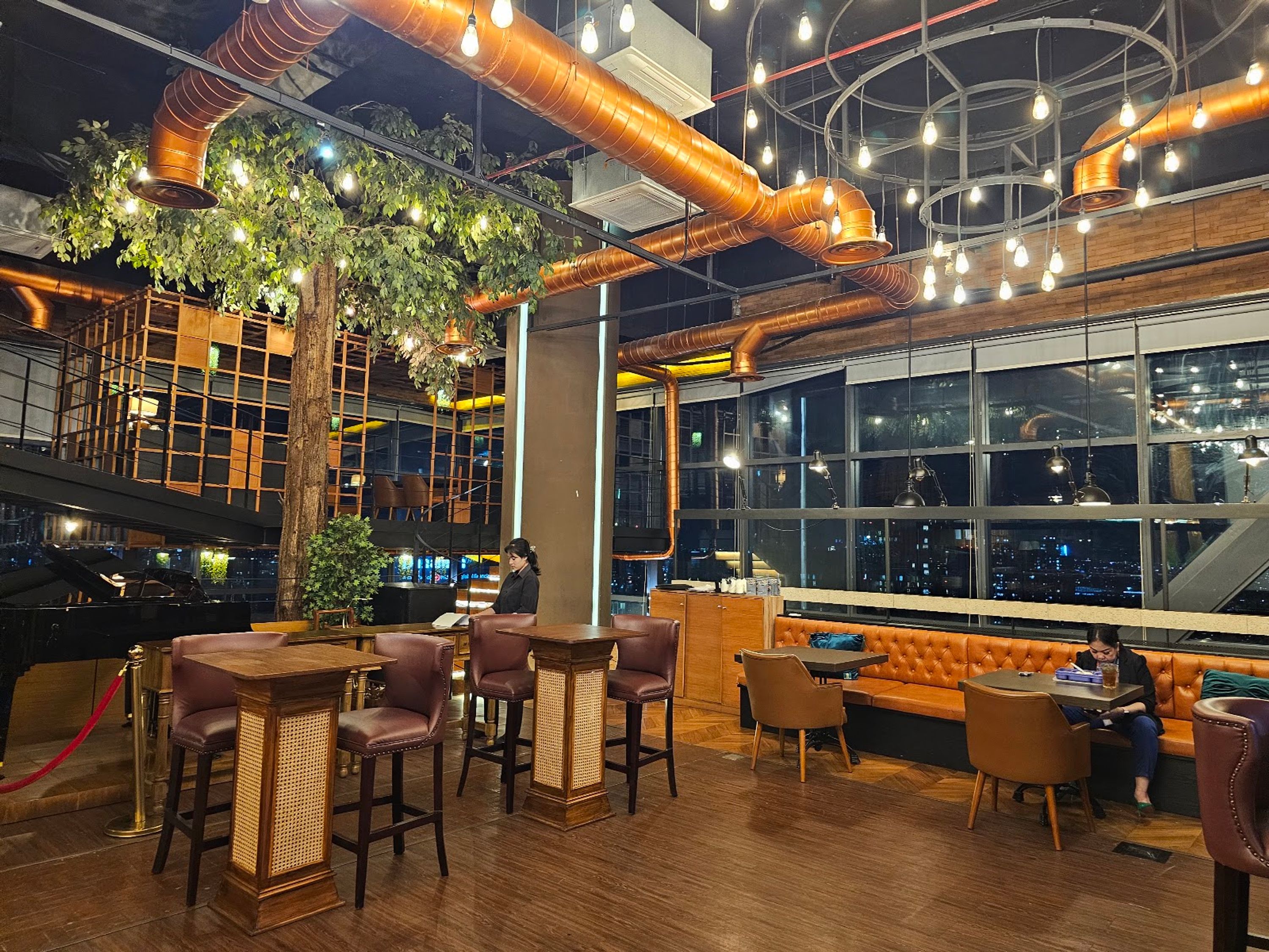 Located on the 30th floor of Lippo Kuningan building, this rooftop venue offers panoramic city views through floor-to-ceiling windows and open-air seating areas designed with modern furniture and sophisticated lighting that creates an upscale dining environment.