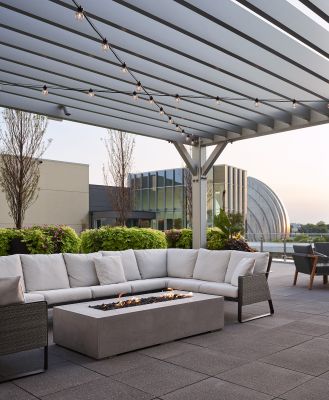 Horsefeather Social occupies the seventh floor of the Loews Kansas City hotel, featuring an outdoor terrace that provides panoramic views of downtown Kansas City with reflections of the Kauffman Center visible on its glass facade.