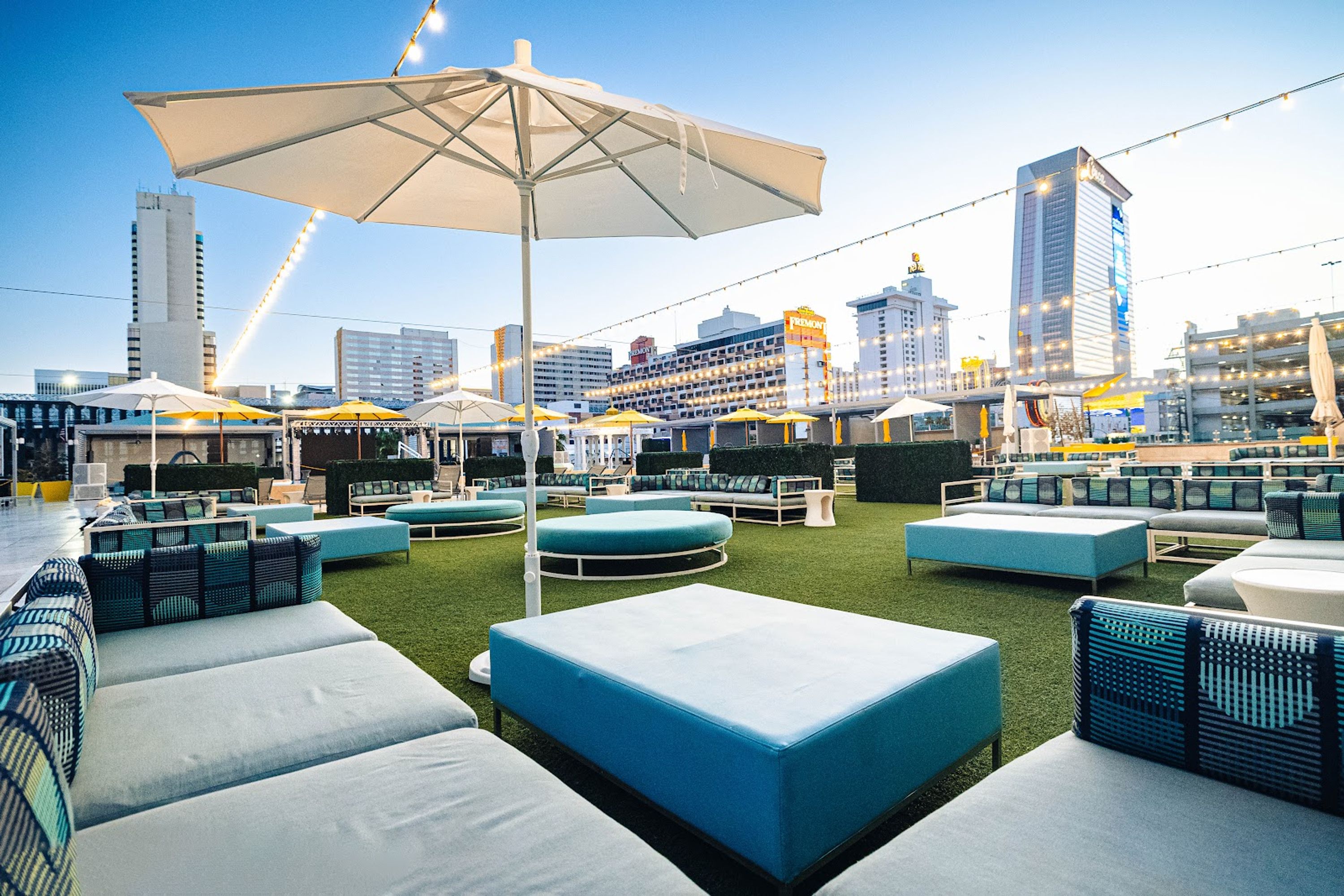 This expansive 35,000-square-foot rooftop pool deck atop the Downtown Grand Hotel features a heated swimming pool, shaded cabanas, outdoor daybeds, and panoramic views of the Las Vegas skyline.