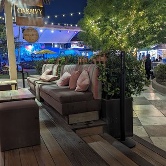 Oak & Ivy features an open-air rooftop terrace providing panoramic views of downtown Las Vegas, complemented by indoor seating and a ground-floor outdoor patio within Container Park.