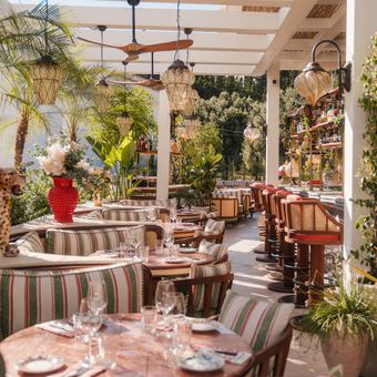 This elevated dining venue features an open-air terrace surrounded by olive and citrus trees, artisanal lanterns, and contemporary furnishings with panoramic views of La Concha mountain and the Mediterranean Sea.