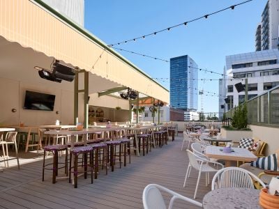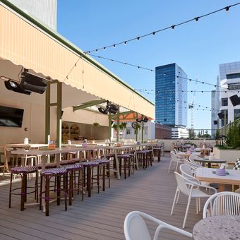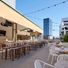 This elevated establishment features an open-air terrace with city skyline views, outdoor seating under umbrellas, a modern bar area, and versatile spaces that accommodate both casual dining and private events throughout the day and evening.
