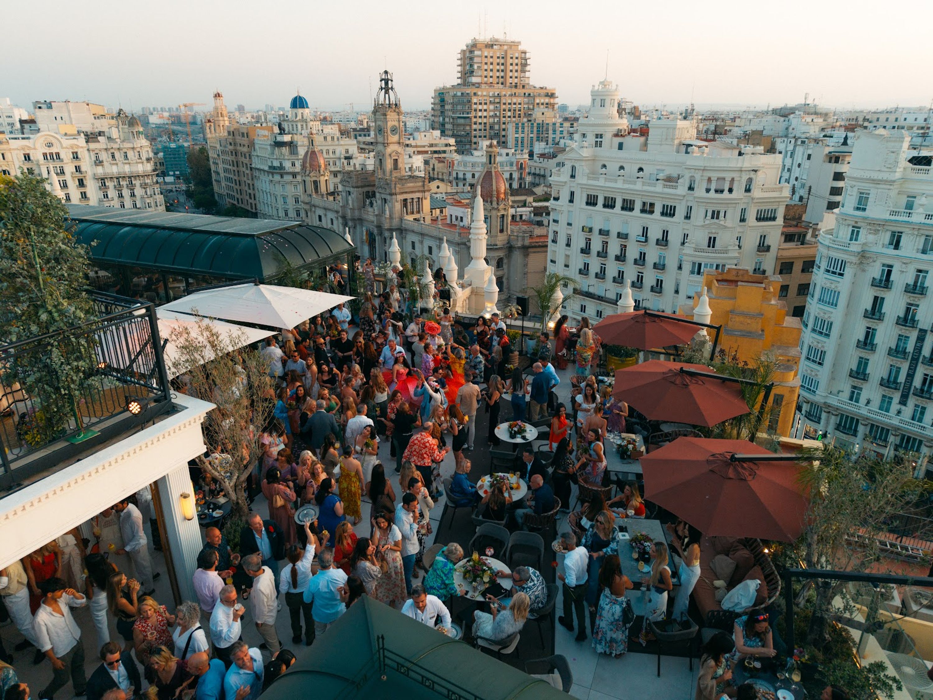 The heated indoor pergola area provides 360-degree views of Valencia, while the outdoor Town Hall Balcony offers direct vistas of the historic square below.