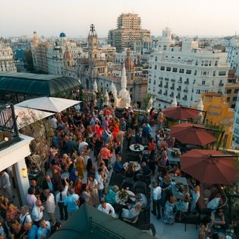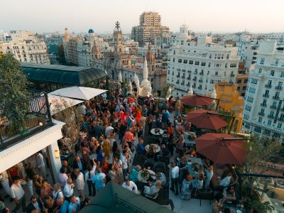 Atenea Sky Rooftop features an outdoor terrace spanning over 400 square meters on the eighth floor, providing panoramic views of Valencia's skyline from an elevated position in the historic city center.
